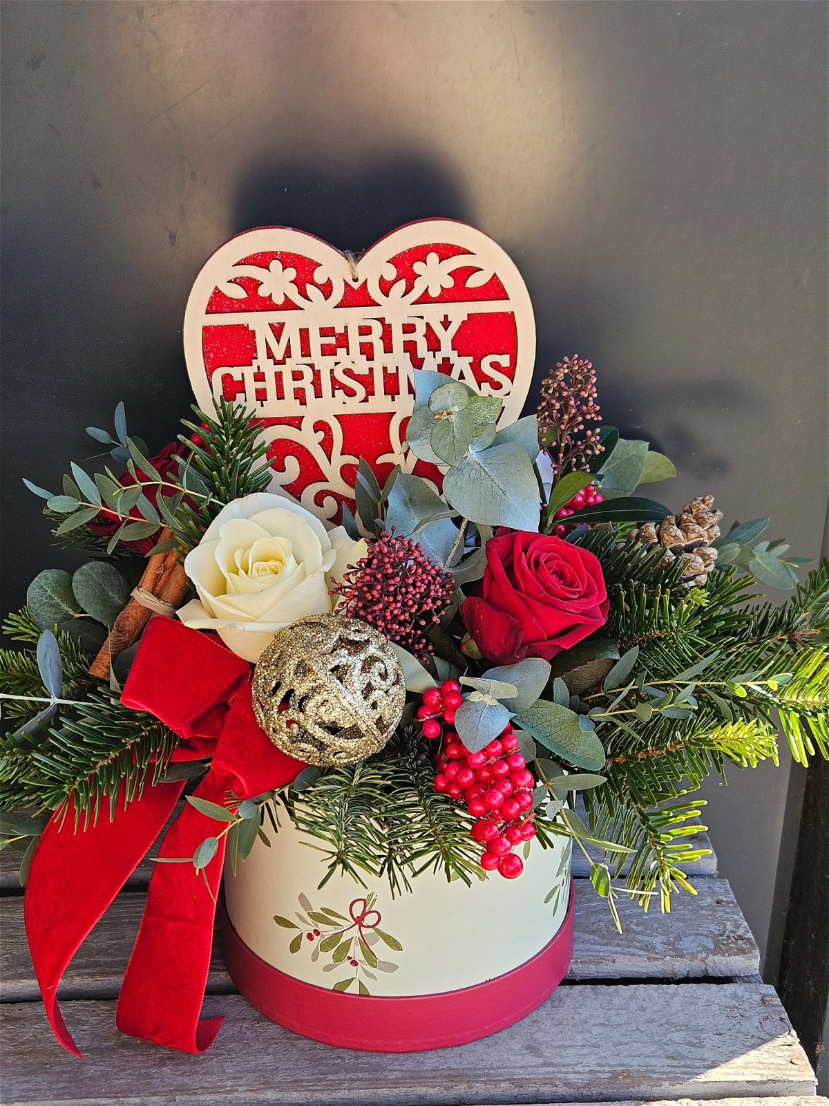Stunningly scented hatbox with flowers and natural pine cones.