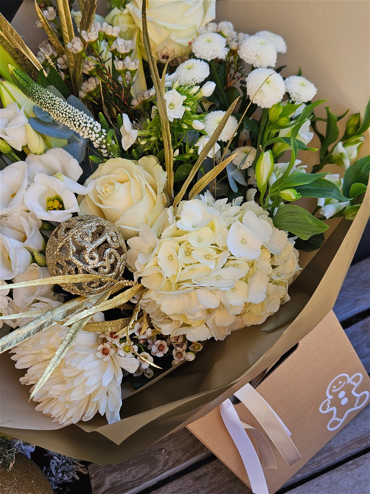 Luxury mix of cream flowers and gold accents. In a gingerbread theme packaging and gold wrap.